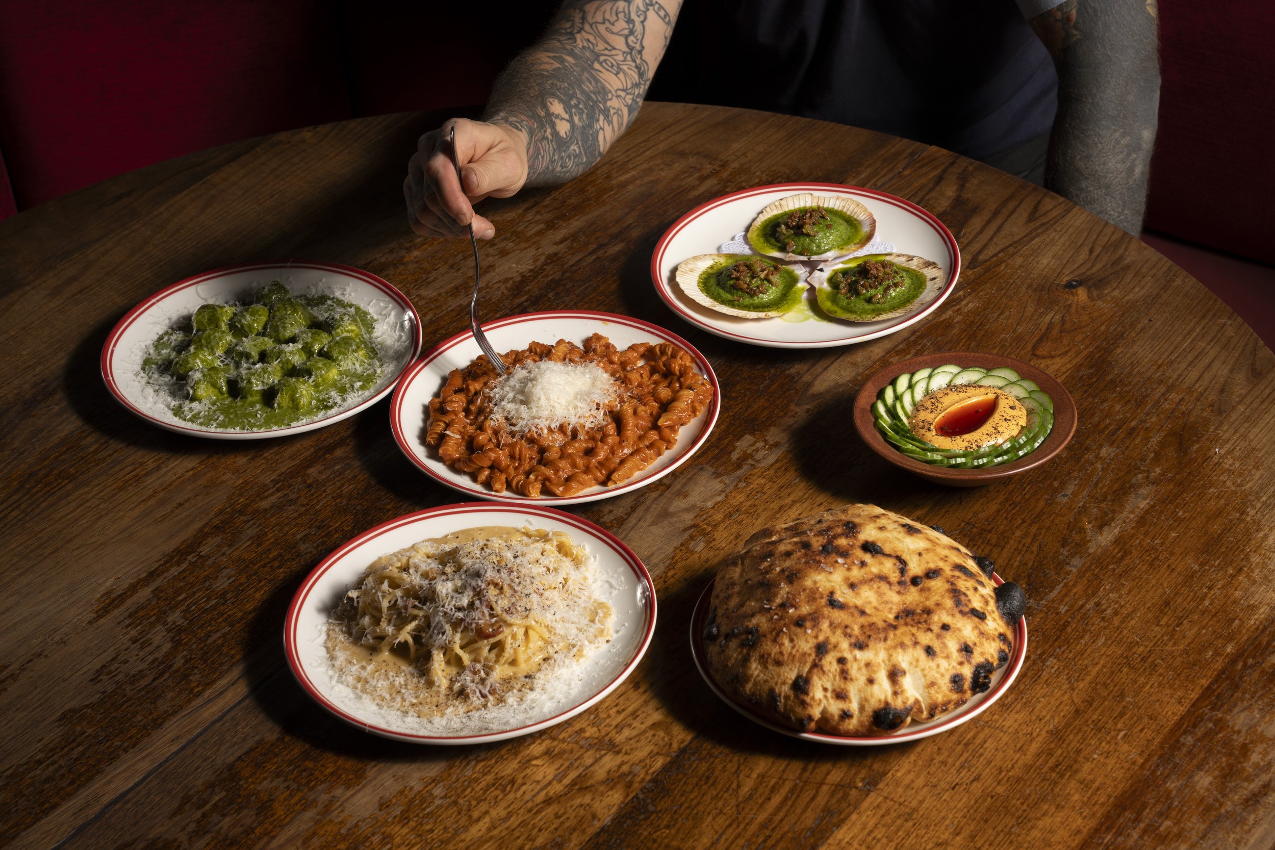For this shoot I captured the space and dishes on a mix of film and digital, focusing on the natural energy of the restaurant along with the textures and colour of the food. Thin foldable pizza slices, handmade pastas and seasonal dishes were photographed in a way that highlights both the flavour and the setting they’re served in.