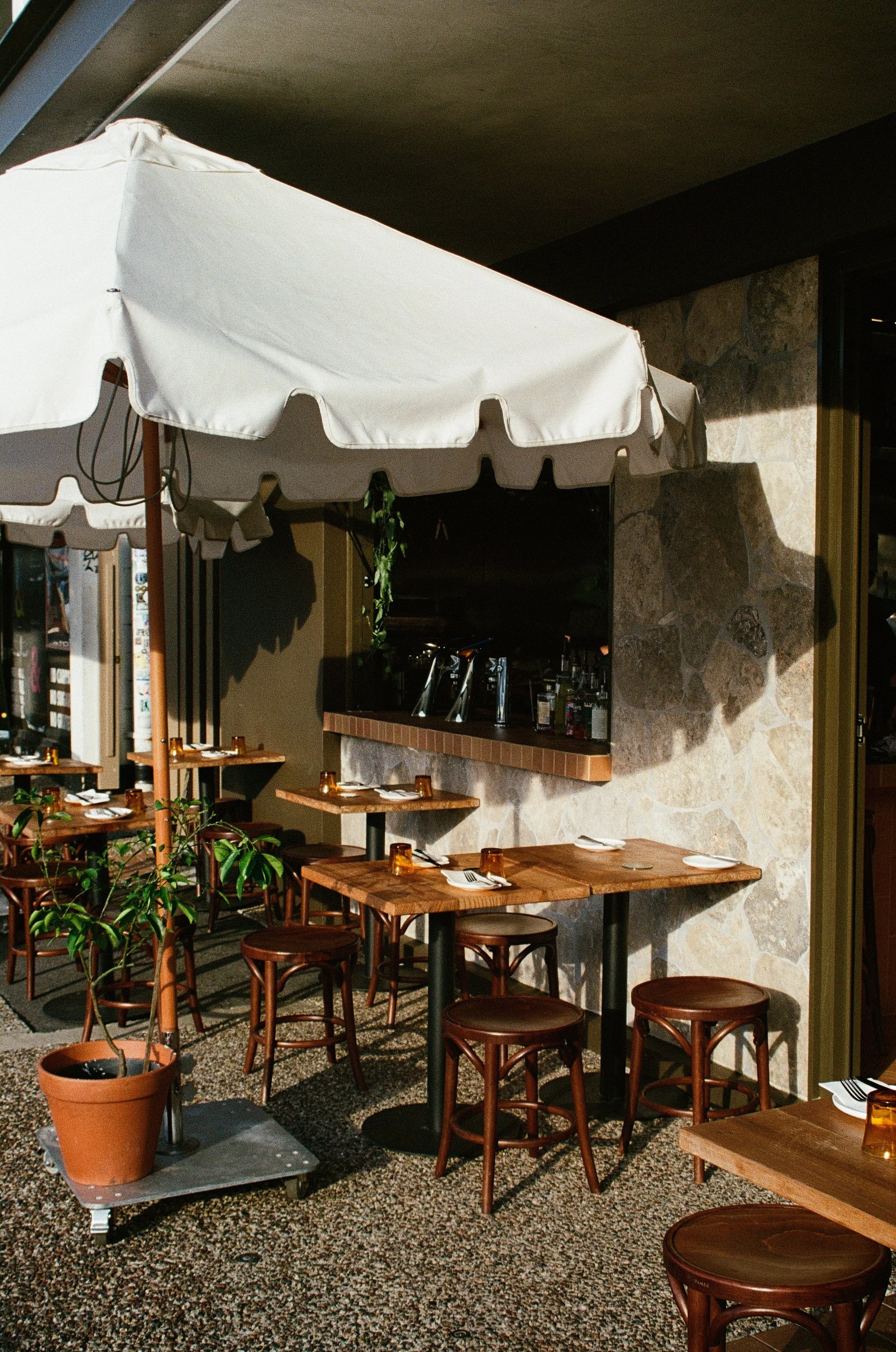 Terracotta tiling runs throughout the fit-out, giving the interior a warm Mediterranean feel. When golden hour hits in the afternoon, the light moves across the tiles and out toward the street where the outdoor tables spill onto the sidewalk, making it feel like you’re part of the neighbourhood buzz rather than separate from it.